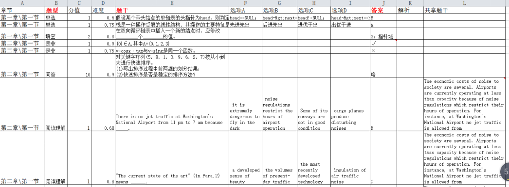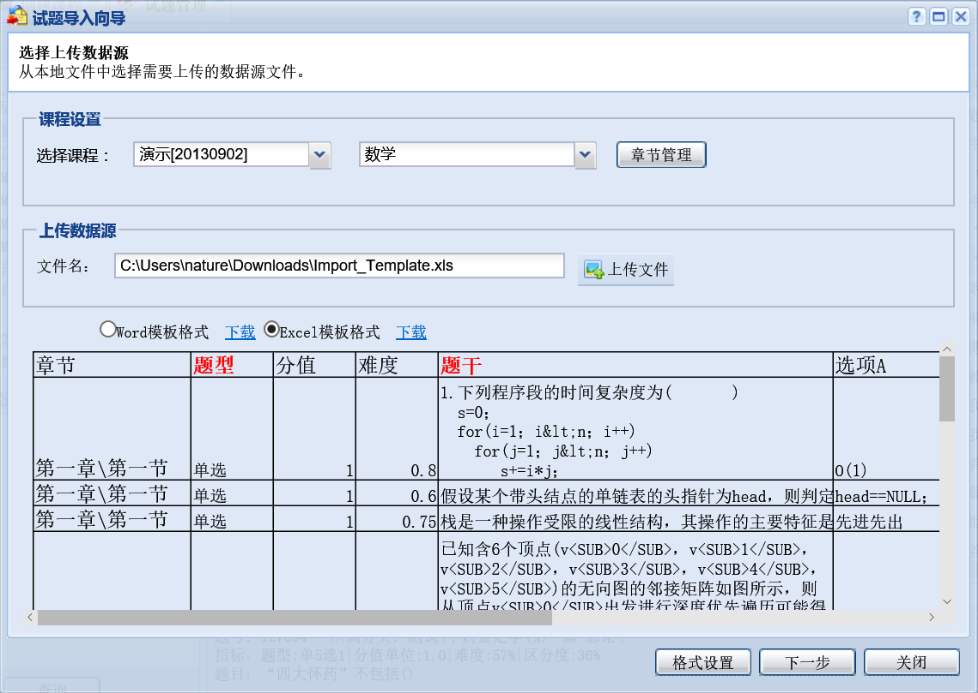 选择课程,选择章节,上传包含试题的Word或Excel文件。