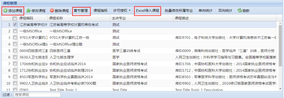 点击导航菜单红的 试题统计”,选择课程可以统计课程中的题目数量