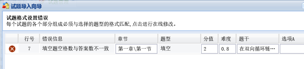 3)如果检查到数据格式有错误,系统会给出提示,可以在表格中直接编辑行,修正错误,再继续导入题库。